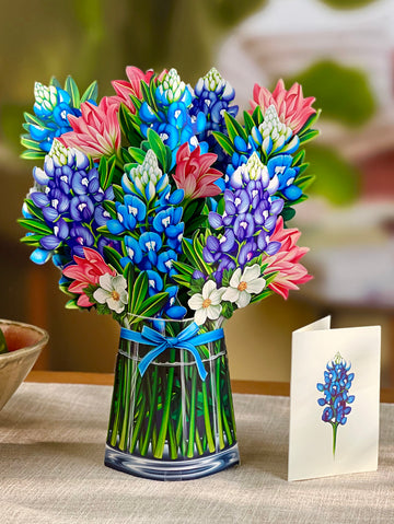 - Includes: bouquet, matching bouquet note card, paper vase and vibrant mailing envelope